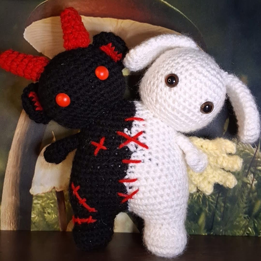 The Terrible Twos are conjoined companions born of chaos and cuddles. A tangle of opposing natures bound together in yarn and whimsy.